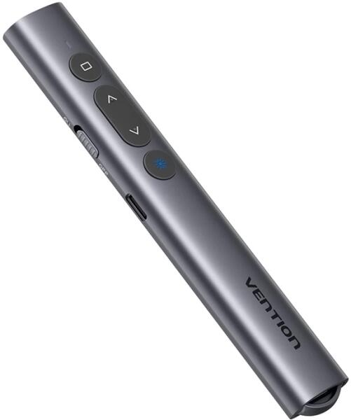 PPT Vention vezeték nélküli lézeres mutató (zöld) A Vention vezeték nélküli mutatója 3R-osztályú zöld lézert használ, amely a hagyományos vörös lézerekhez képest jobb láthatóságot biztosít a LED-képernyőkön. Az akár 100 méteres hatótávolság lehetővé teszi, hogy szabadon mozoghasson a szobában, a távirányító funkció pedig 50 méteres körzetben működik, teljes 360°-os hatótávolsággal. A 2,4 GHz-es átviteli technológia stabil kapcsolatot biztosít késedelem nélkül, akár falakon keresztül is. A készülék nem igényel illesztőprogramokat - csak csatlakoztassa az USB-A/USB-C vevőegységet, ami gyors indítást tesz lehetővé a legtöbb laptopon. Megbízható tápegység A beépített 200 mAh lítium akkumulátor USB-C-n keresztül körülbelül egy óra alatt feltöltődik, és alkalmi használat mellett akár 3 hónapos működést tesz lehetővé. Állapotát egy LED-lámpa jelzi - a villogó piros fény alacsony töltöttséget, az egyenletes fény töltést, a fény nélküli pedig teljes töltöttséget jelez. A prezentáció működtetése magában foglalja a diák cseréjét, a hiperhivatkozások kiválasztását és elindítását, valamint az ablakváltást. Hosszabb gombnyomásra a teljes képernyős módot lehet bekapcsolni vagy a képernyőt elhalványítani. Széles körű kompatibilitás A beépített mágneses vevőegység a kijelző házába dugható, hogy ne veszítse el. A készülék Windows, macOS, Linux, Android, iOS és iPadOS operációs rendszerekkel, valamint a népszerű irodai szoftverekkel - PowerPoint, Word, Excel, Outlook, OneNote, Visio vagy Keynote - működik. A további tippek megkönnyítik a fejlett funkciók használatát, beleértve a teljes képernyős prezentációk támogatását a platformok között. Tartalmazza a következőket: